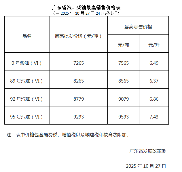 根据国家成品油价格形成机制,结合近一段时期国际市场油价变化情况,国家发展改革委决定自2025年10月27日24时起下调国内成品油价格,即在现行价格的基础上,我省汽、柴油价格每吨分别下调265元和255元。调整后,我省成品油最高销售价格见下表。