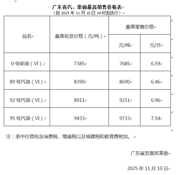 根据国家成品油价格形成机制,结合近一段时期国际市场油价变化情况,国家发展改革委决定自2025年11月10日24时起上调国内成品油价格,即在现行价格的基础上,我省汽、柴油价格每吨分别上调125元和120元。调整后,我省成品油最高销售价格见下表。
