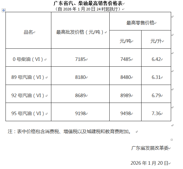 根据国家成品油价格形成机制,结合近一段时期国际市场油价变化情况,国家发展改革委决定自2026年1月20日24时起上调国内成品油价格,即在现行价格的基础上,我省汽、柴油价格每吨均上调85元。调整后,我省成品油最高销售价格见下表。